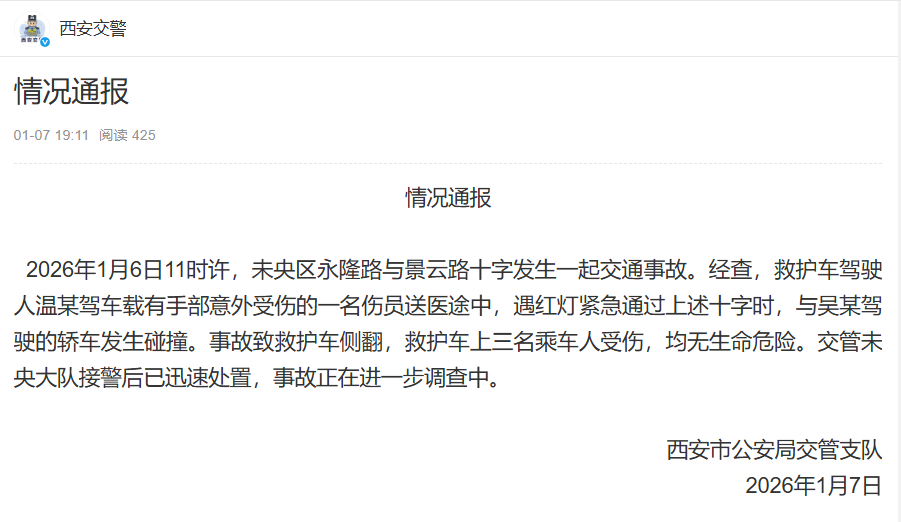 央广网北京1月7日音讯 陕西省西安市公安局交管支队1月7日发布情况通报:2026年1月6日11时许,未央区永隆路与景云路十字产生一同交通事端。经查,救助车驾驭人温某驾车载有手部意外受伤的一名伤员送医途中,遇红灯紧迫经过上述十字时,与吴某驾驭的轿车产生磕碰。事端致救助车侧翻,救助车上三名搭车人受伤,均无生命危险。交管未央大队接警后已敏捷处置,事端正在进一步查询中。